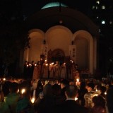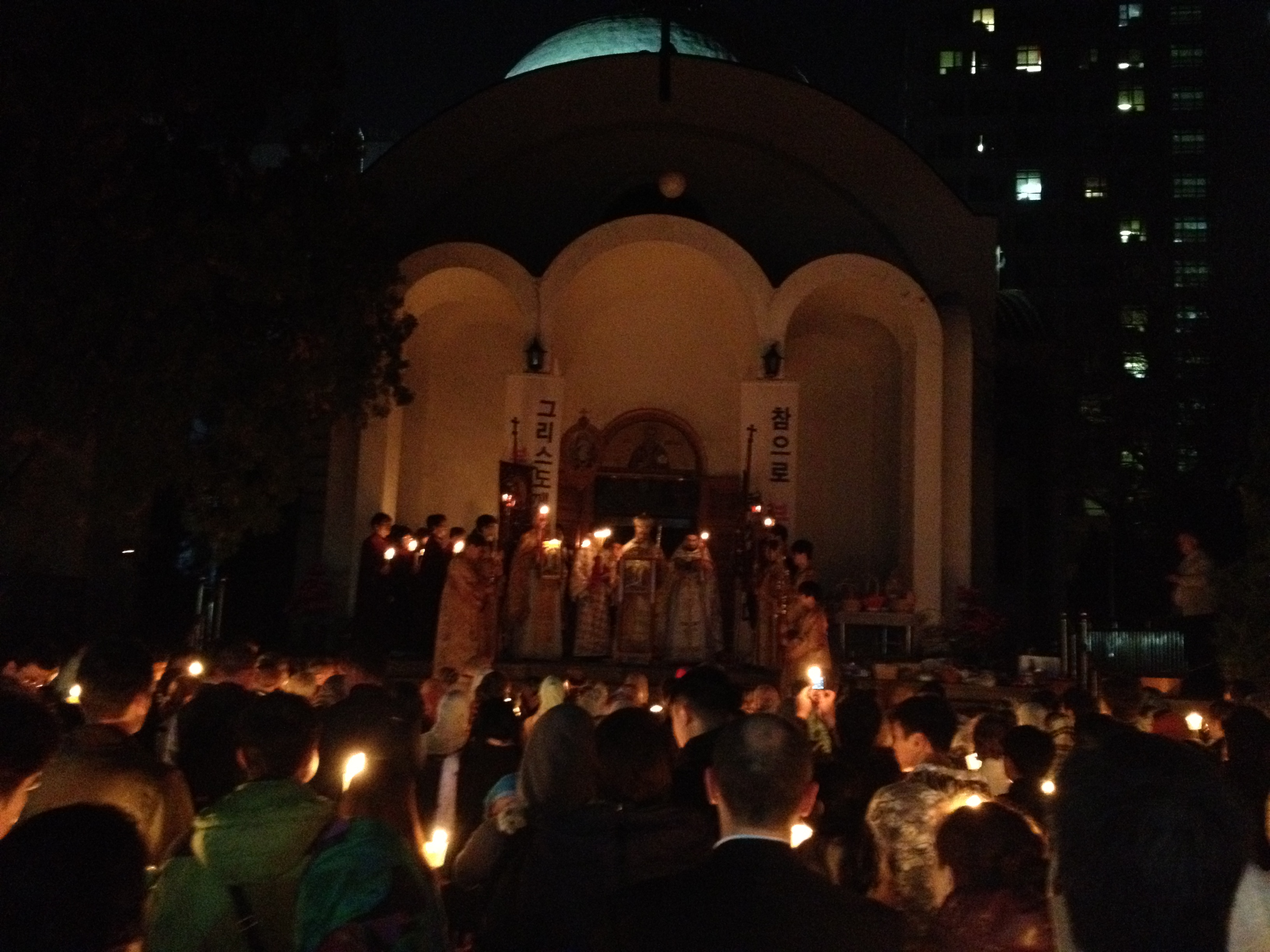 Възкресение Христово беше провъзгласено в събота срещу неделя в немногото православни християнски храмове в Южна Корея. По традиция и тази година българите в Сеул посетиха гръцкия храм в града, за да отбележат най-големия празник на християните. По-долу ще намерите снимки от тържественото богослужение, както и от Великденското тържество от следващия ден, 15 април 2012 г. Още за тържеството четете тук (линк).