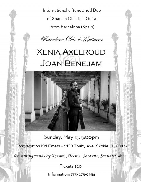 On Sunday, May 13th, at 5 p.m. the unique Barcelona Guitar Duo is coming right from Spain to have a concert at the new Salon’s welcoming home – Congregation Kol Emeth (5130 Touhy Ave. Skokie, IL, 60077)!
