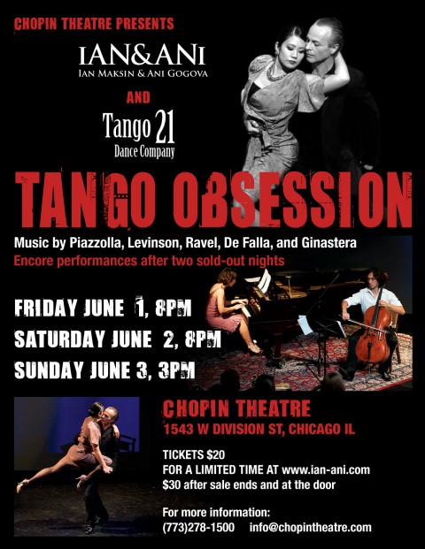 I am so excited to invite you once again to hear my duo with cellist Ian Maksin! After two completely sold out nights last month Chopin Theatre has invited our production Tango Obsession for three more performances over the weekend. We will perform music by Piazzolla, Ravel, Ginastera and make the world premiere of a new piece by Chicago based composer Ilya Levinson. Together with us on stage are Jorge Niedas and his dancers from Tango 21 Dance Company. Please check out the trailer for the performances with footage from last month concerts: