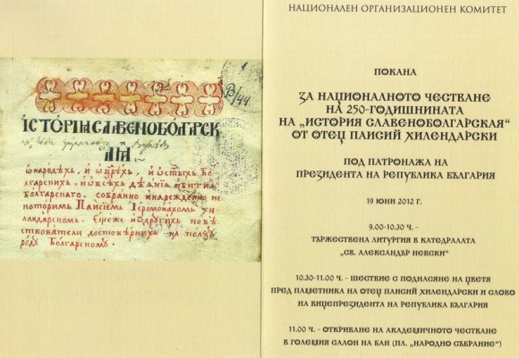 Аз, Паисия, йеромонах и проигумен хилендарски, събрах и написах, от руските прости речи преведох на българските и славянски прости речи. Разяждаше ме постепенно ревност и жалост за моя български род, че няма наедно събрана история за преславните деяния от първите времена на нашия род, светци и царе. Така и много пъти сърбите и гърците ни укоряваха, че нямаме своя история. Аз видях по много книги и истории написани много сведения за българите. Затова положих много труд за две години да събирам по малко от много истории; и в Немска земя повече с това намерение ходих. Там намерих Маврубировата история за сърбите и българите, накратко за царете , а за светците никак не писал. Бил латинин, не почитал българските и сръбските светци, които просияли после, когато латините се отделили от гърците. Но и за сръбските светци пише лошо и скрива, а за българските никак не се споменава. Така аз презрях своето главоболие, от което много време страдах, така и от стомах много време боледувах – това презрях поради голямото желание, което имах. И от много време погребаните и забравени неща едва събрах заедно – написах речи и думи. Не съм учил никак нито граматика, нито светски науки, но за простите българи просто и написах. Не се стараех според граматиката да нареждам речите и да намествам думите, но да събера заедно тая историйца.