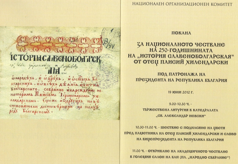 ЗА БЪЛГАРСКИЯ НАРОД, ЦАРЕ И СВЕТИИ И ЗА ВСИЧКИ БЪЛГАРСКИ ДЕЯНИЯ И СЪБИТИЯ. СЪБРА И НАРЕДИ ПАИСИЙ ЙЕРОМОНАХ, КОЙТО ЖИВЕЕШЕ В СВЕТА ГОРА АТОНСКА И БЕШЕ ДОШЪЛ ТАМ ОТ САМОКОВСКАТА ЕПАРХИЯ В 1745 ГОДИНА. А СЪБРА ТАЗИ ИСТОРИЯ В 1762 ГОДИНА ЗА ПОЛЗА НА БЪЛГАРСКИЯ РОД.