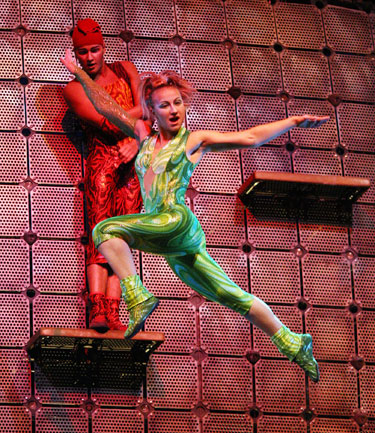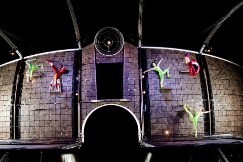 опровергая закон всемирного тяготения, пятерка бесстрашных воздушных гимнастов (женщины в зеленом – стихия Воды, мужчины в красном – стихия Огня) использует батуты на вертикальной стене как трамплин для прыжков. Они в воздухе, с головокружительной
