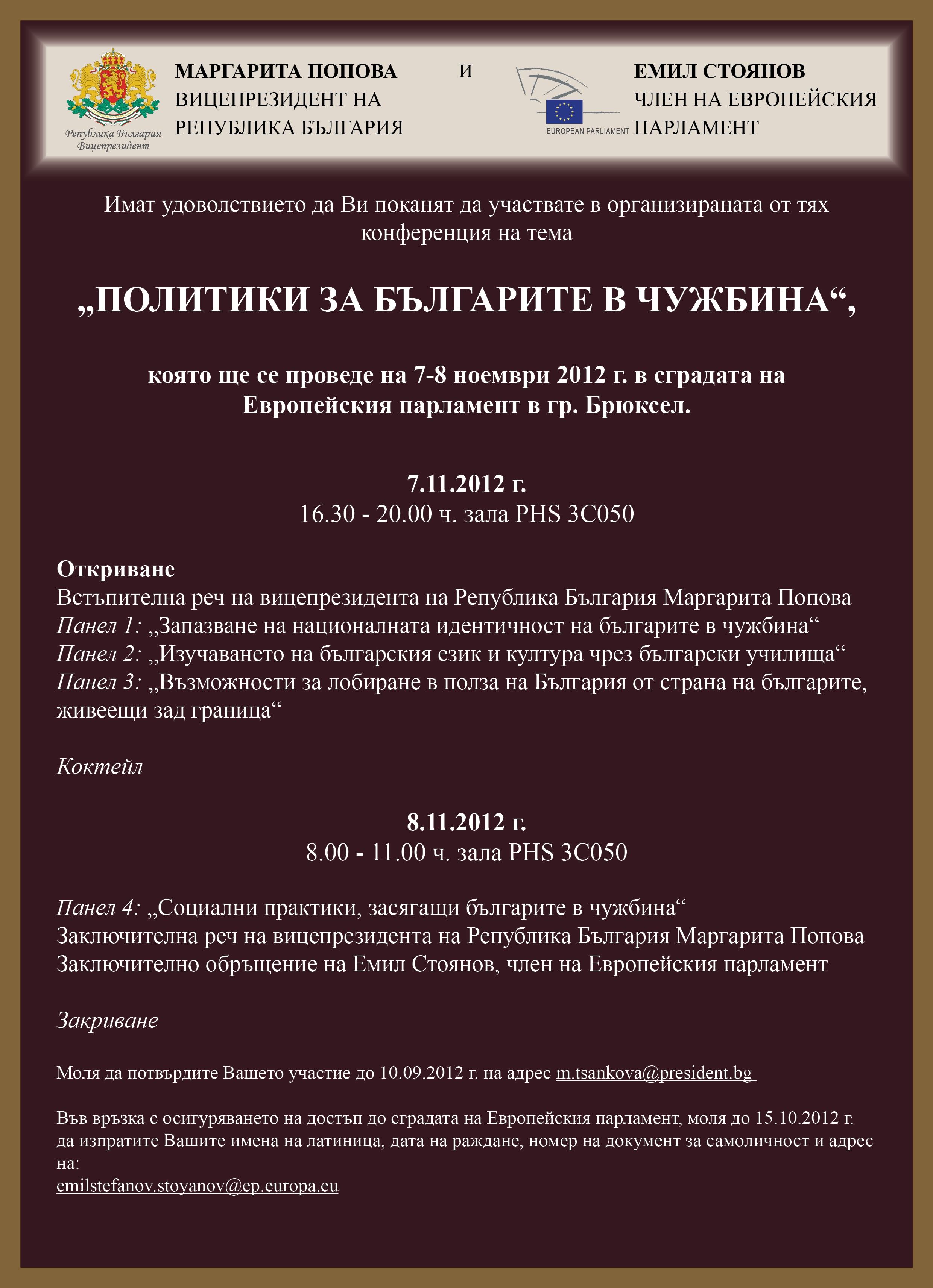 Имам удоволствието от името на Вицепрезидента на Република България г-жа Маргарита Попова да Ви изпратя покана за конференцията, която тя заедно с депутата от Европейския парламент Емил Стоянов организира през месец ноември в Брюксел. Надявам се искрено, че ще имате възможност да обсъдите заедно с нас политиките за българите в чужбина, които след това обмисляме да залегнат в Стратегията за българите в чужбина.