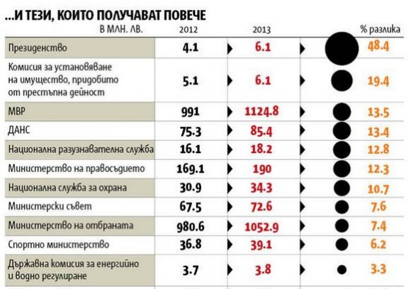 Увеличен бюджет (за силовите структури): МВР +13.5%, ДАНС +13.4%, НРС +12.8%, НСО +10.7%