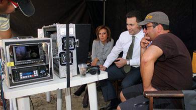 Премиерът Груевски (в средата) и министърката на културата (зад него) посещават снимачната площадка на филма “Трето полувреме”. Снимка: в. Дневник“