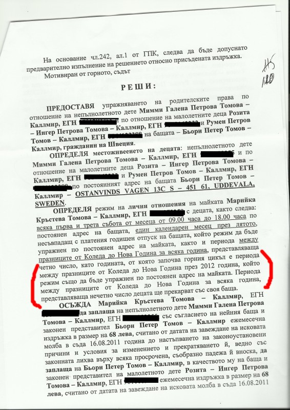 Тъй че аз разполагам с пълни родителски права на територията на Р. България, стига децата да се върнат. Но г-н Саид Улссон не уважи Режима за лични контакти, който влизаше в сила от Коледа до Нова година, и вместо да изпрати децата на адвокатката ми г-жа Рюби, той е издал три Удостоверения, в които продължава да лъже, че уж съм нямала родителски права. Бащата на децата Петер Каллмир обаче също апелира за помощ на децата от българска страна и няма нищо против те да се върнат обратно в България, защото животът на трите ни деца в Швеция е застрашен, в случаи като нашия децата не биват пожалвани. Той смята, че съдебният си процес на първа инстанция в гр. Уддевалла през ноември 2012 г. е бил изопачен, като неговия адвокат (г-н Хйелмарссон мисля, че се казва) е предал интересите на децата и е взел според бащата страната на социалните служби. Чиито твърдения пред съда не са основани на лекарската ни документация, а на клюки и клевети.
