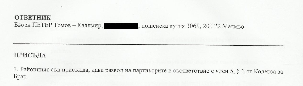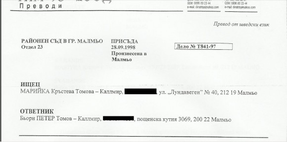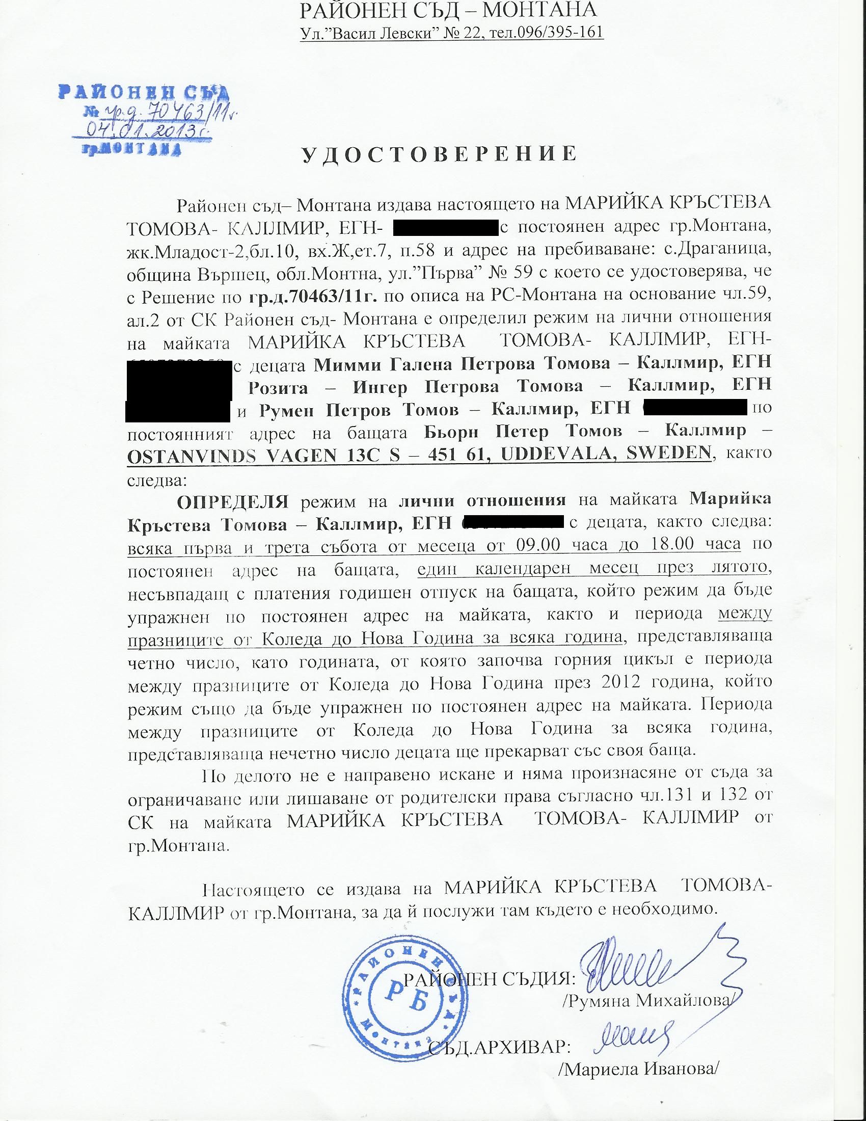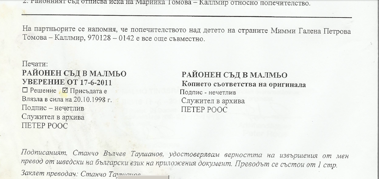 Шведските социални служби от Община Уддевалла ме заблудиха на 19 декември 2012 г., че съм си изгубила родителските права в „български учреждения“, където ми казаха да се обърна за справка. Справка с 2-те съдебни дела – с Решение по гражданско дело № 70463 от 2011 г. на МРС – Монтана, влязло в сила от 07.11.2011 г., както и Решението на Окръжния съд в гр. Малмьо (Тиингсреттен) от 28.09.1998 г., показват, че съм с непокътнати, неограничени и неотнети ми родителски права! И по двете присъди! Но вицепредседателят на Социалния съвет (Сусиолнеемнден) г-н Сааид Улссон в 3 бр. нови „удостоверения“ за трите деца от 19.12.2012 г. отказва да ги уважи. Позовавайки се на изказване на бащата Петер, без да е проверил, очевидно, съдържанието на двете гореупоменати съдебни решения.