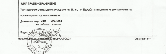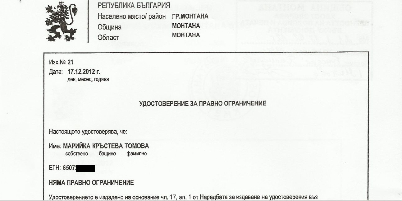 Удостоверение за правно ограничение № 21/ 17.12.2012 г., издадено от служба ГРАО, Община Монтана, с което се удостоверява, че Марийка Кръстева Томова няма правно ограничение.