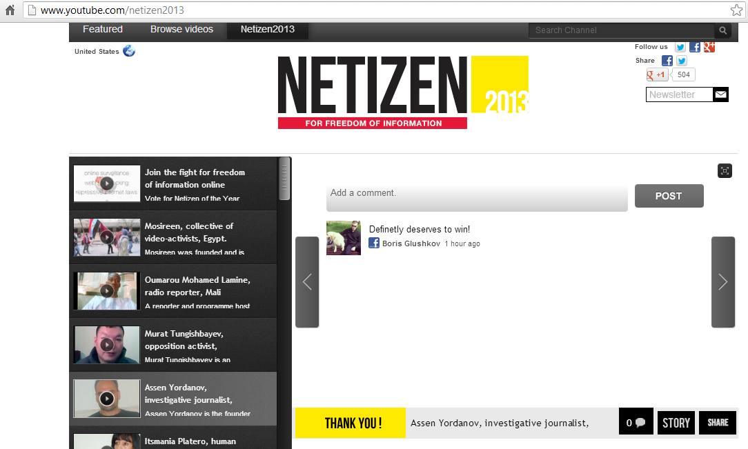 За да гласувате: http://www.youtube.com/netizen2013. Кликнете на името на Асен Йорданов, за да изгледате презентацията и натиснете на Vote. Директен линк за гласуване и споделяне: http://bit.ly/Xju5sG