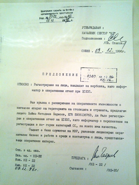 Предложението за регистрация на секретния сътрудник Бойко Борисов е подписано от оперативен работник обозначен като НБ-22. С него се е съгласил (но подпис липсва) колегата му НБ-20. Предложението е утвърдено от началника на сектор „НБ“ в ЦСБОП – подполковник Спас Спасов. Това е и единственото име с подпис в документа.