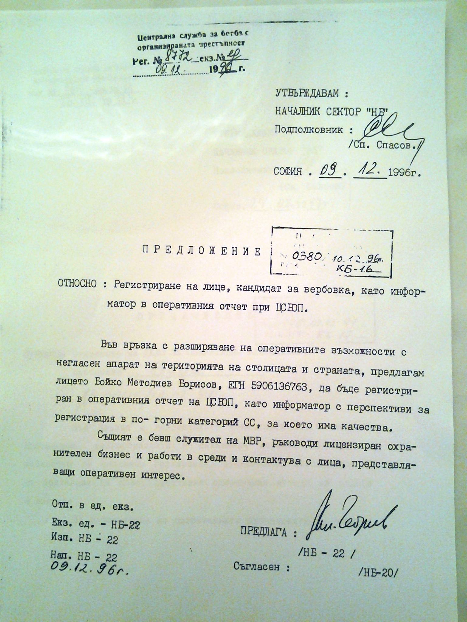 * Документ: Няма видим гриф. Предложение за вербовка на Бойко Методиев Борисов от оперативен работник НБ-22, подписано от него. Липсва подпис за съгласие на оперативен работник НБ-20. Документът съдържа 1 страница. Отпечатан е на 09.12.1996 г. на пишеща машина в един екземпляр от самия НБ-22. Регистрационният му номер е 8772 от 09.12.1996. Положена е резолюция за утвърждаване от началник сектор „НБ“ подполковник Сп. Спасов с неговия подпис на дата 09.12.1996. След резолюцията предложението е регистрирано с номер 0380 от 10.12.1996 от регистратор с инициали КБ-16 Документът и резолюцията са напечатани на една и съща пишеща машина с характерен наклон на долната хоризонтална черта на малката буква д.