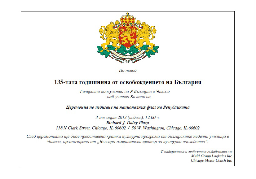За поредна година ще отбележим Националния празник на Р. България 3-ти март на открито, под звуците на националния химн и националния ни флаг в центъра на Чикаго. За желаещите отново има организиран транспорт, според получените заявки.