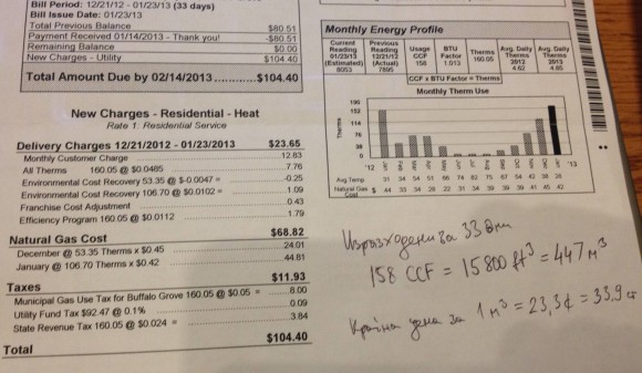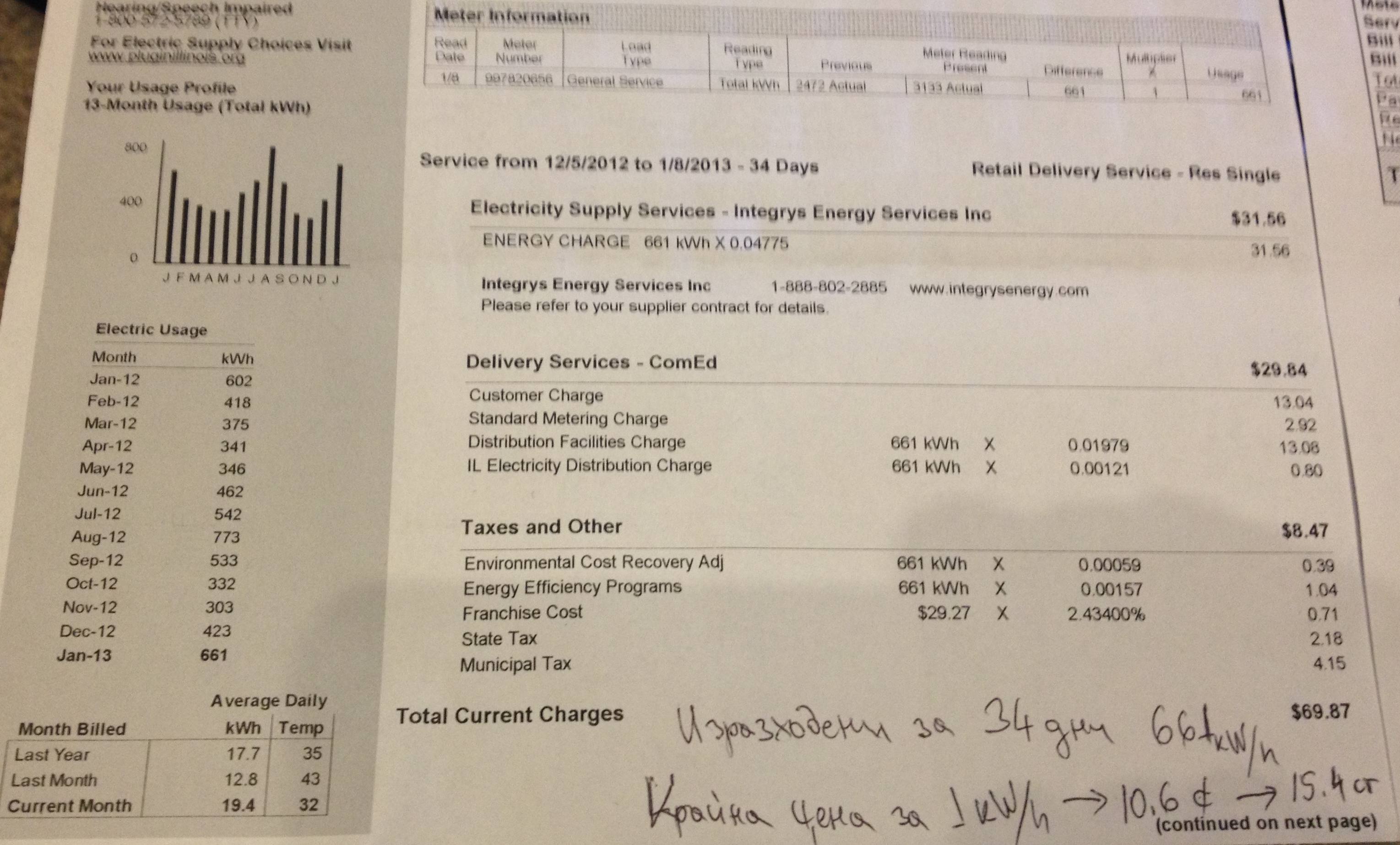Това са сметки на българско семейство, живеещо в къща с площ от 170 м2 в северно предградие на Чикаго. Там средната цена на домовете е 364 хил. лв. ($250,000), при среден доход на семейство от 145,5 хил. лв./год. ($100,000) или над 12 хил. лв./месечно. Така в най-тежкия за отопление и осветление месец това семейство заделя по-малко от 3% от месечния си доход, за да живее на топло и светло.