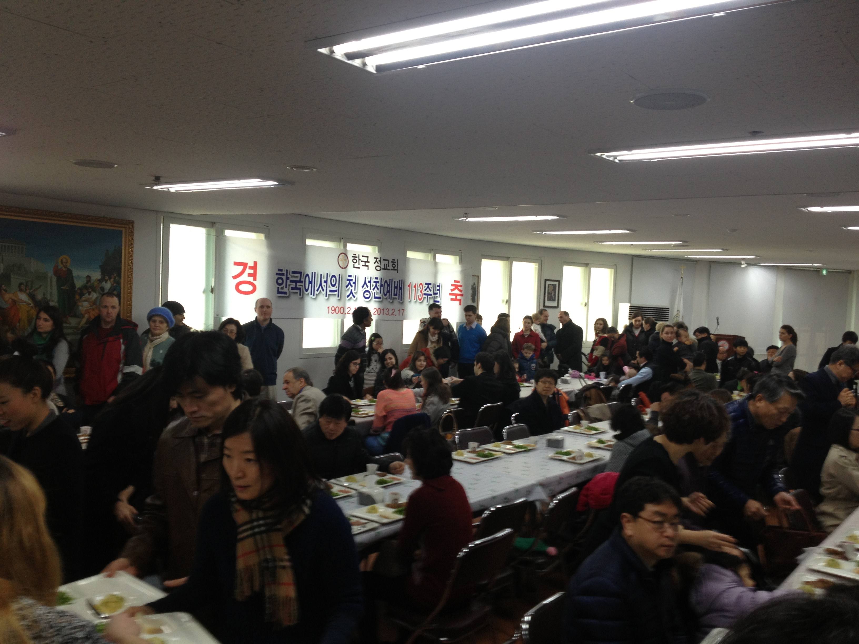 Първоначално присъстващите почетоха неделната литургия в храма. След това родолюбивите българи, собственици на рeсторант „Зелен“, братята Михаил и Филип Ашминови, поканиха всички на обяд в трапезарията на църквата. Както винаги, майсторите готвачи Васил Терзийски и Марин Маринов поднесоха вкусни български ястия на гостите. Заедно с българите тържественият обяд беше споделен и от други вярващи, не само от Корея, но и от Русия, Гърция, Сърбия и др. – близо 400 души.