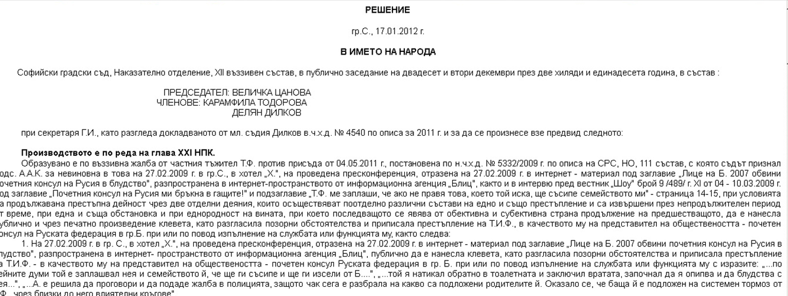 Според решение на СГС от 17.01.2012 г., което не подлежи на обжалване и протест, Тонко Фотев действително е извършил блудствени действия с една от доведените ми пет дъщери, като при това я е заплашвал, че ще унищожи семейството ни и ще ни изсели от Бургас. В същото това решение на СГС ясно е записано, че само съд може да прекрати образуваното срещу него досъдебно производство, което услужлива районна прокурорка от Бургас – Милтиядова удобно е позамразила още от 2010 г. В края на този материал прилагам линк* към това решение на СГС, а също така и две извадки от него, които документират страховете на блудника.