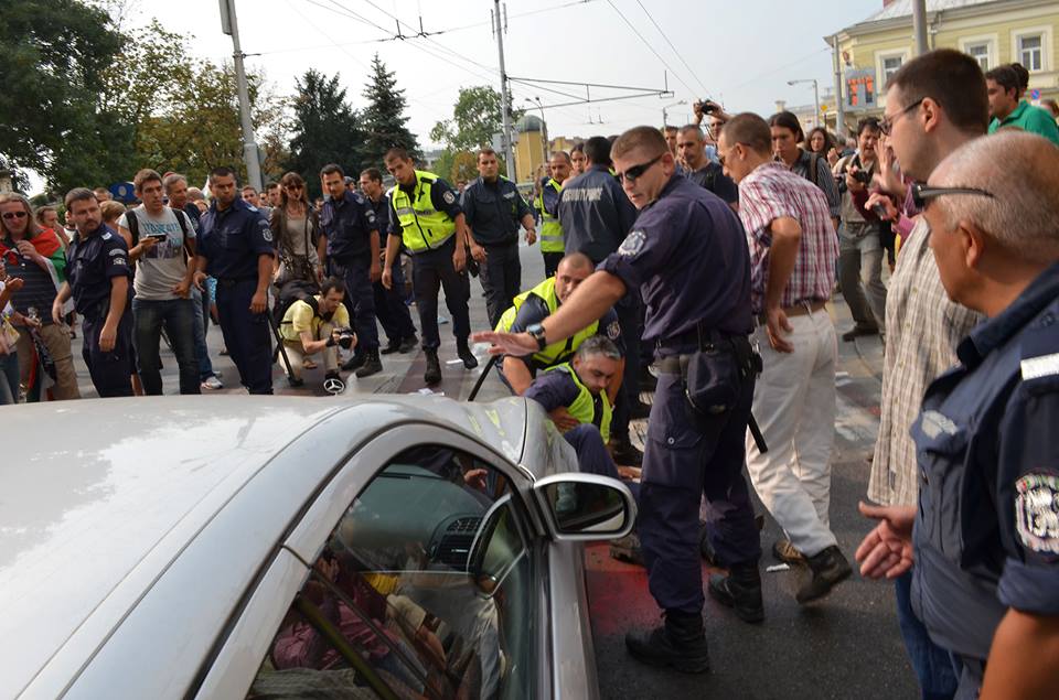 Изнервен шофьор на депутатски автомобил, бързащ за влезе в Парламента, блъсна един от полицаите, които разчистваха коридор за него от протестиращите. След инцидента множество протестиращи предложиха на полицая да бъдат свидетели, ако заведе дело срещу извършителя.