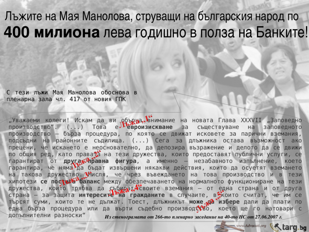 В изложението на г-жа Манолова могат да бъдат посочени няколко откровени неистини, които може би са подвели онази част от народните представители, която никога не си прави труда да се задълбочава в това, което гласува. На първо място, заповедното производство като цяло не е „евроизискване“ – поне не във вида, в който беше възприето от новия ГПК в България. Никъде в нормалните европейски страни не съществува хипотеза, при която частно търговско дружество (колкото и „привилегировано“ да е то, понеже е банка) да може да осъди определено лице (длъжник) само въз основа на едностранно съставени от частното търговско дружество документи за съществуването на дълг; и ако такава правна възможност все пак се намира в правото на някои от страните-членки, тя задължително е балансирана с правото на „длъжника“ да оспори претенцията и да задължи банката да докаже своите права по общия исков ред. Очевидно това не е факт в хипотезата на чл. 417, т. 2 от ГПК, където частните банки са привилегировани наред с държавните и общински учреждения. В този смисъл формулировката „евроизискване“ може да се представи като обикновена манипулация, често използвана от българските политици, за да „омагьосат“ всякакви евентуални възражения с едно неясно и непреодолимо западноевропейско „основание“.