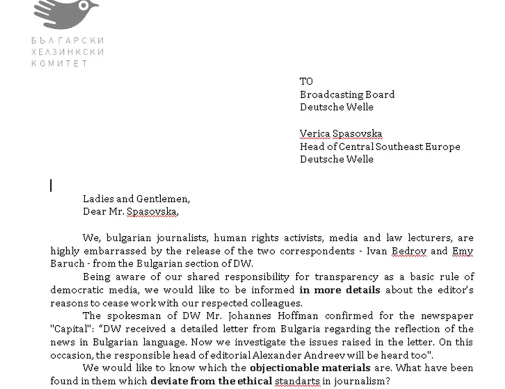 We, bulgarian journalists, human rights activists, media and law lecturers, are highly embarrassed by the release of the two correspondents – Ivan Bedrov and Emy Baruch – from the Bulgarian section of DW.