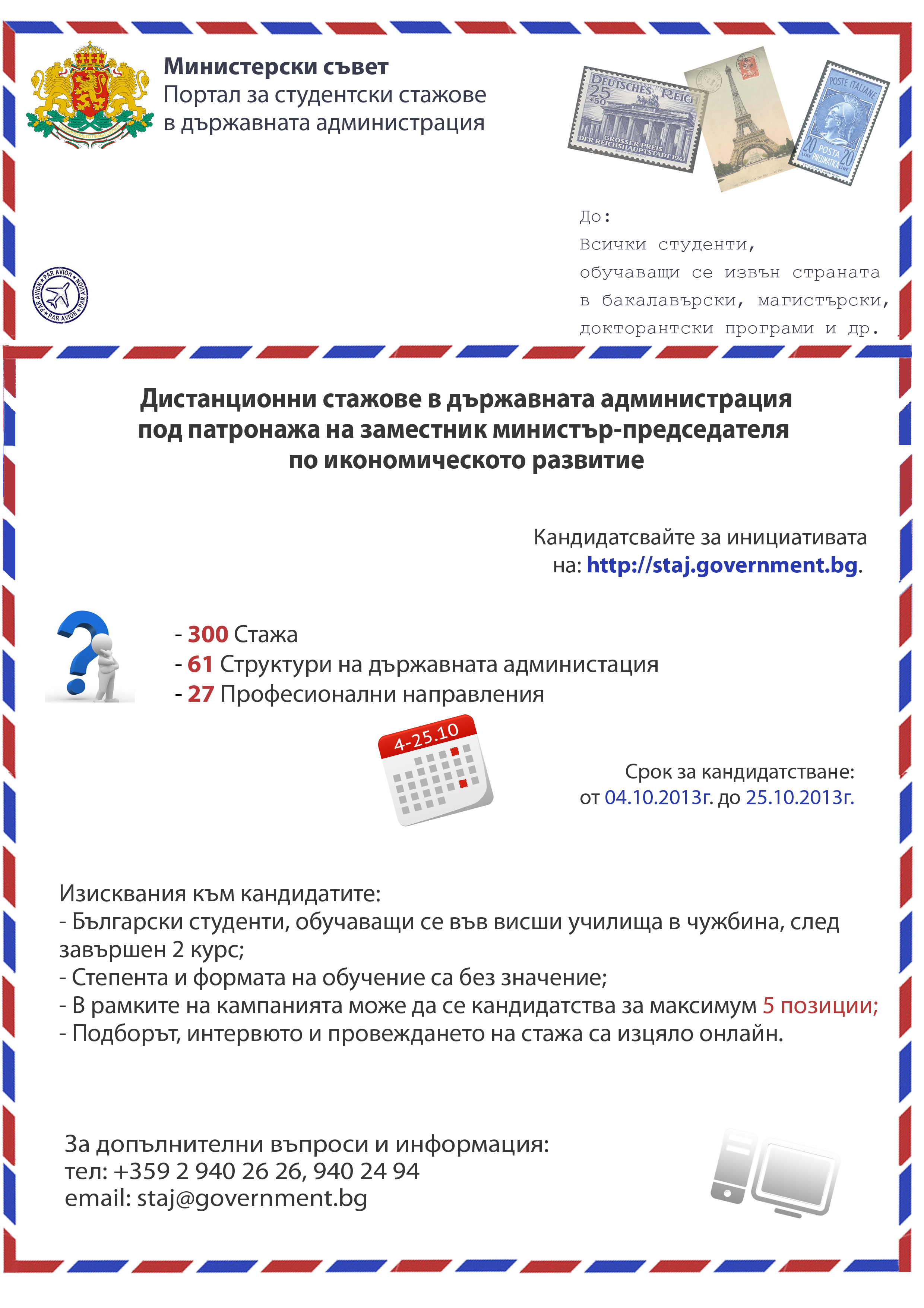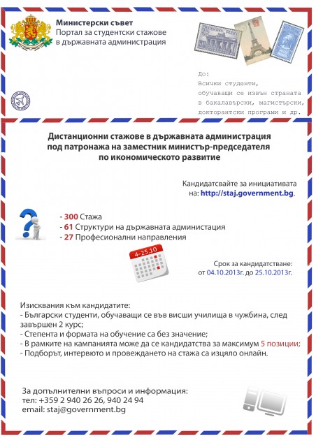 За първи път в държавната администрация на България ще се проведат дистанционни стажове за български студенти, обучаващи се в чужбина. Кандидатите ще могат да кандидатстват за най-малко 300 стажантски позиции, в 27 професионални направления, обявени от 61 структури на държавната администрация. Кандидатстването е изцяло онлайн на Портала за студентски стажове http://staj.government.bg/. Инициативата се провежда под патронажа на вицепремиера по икономическото развитие Даниела Бобева.
