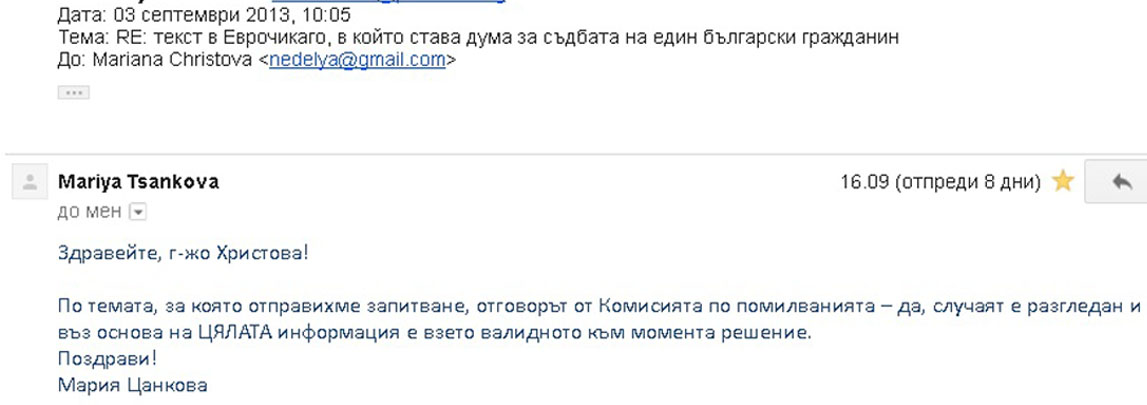 „По темата, за която отправихте запитване, отговорът от Комисията по помилванията – да случаят е разгледан и въз основа на ЦЯЛАТА информация е взето валидното към момента решение.“