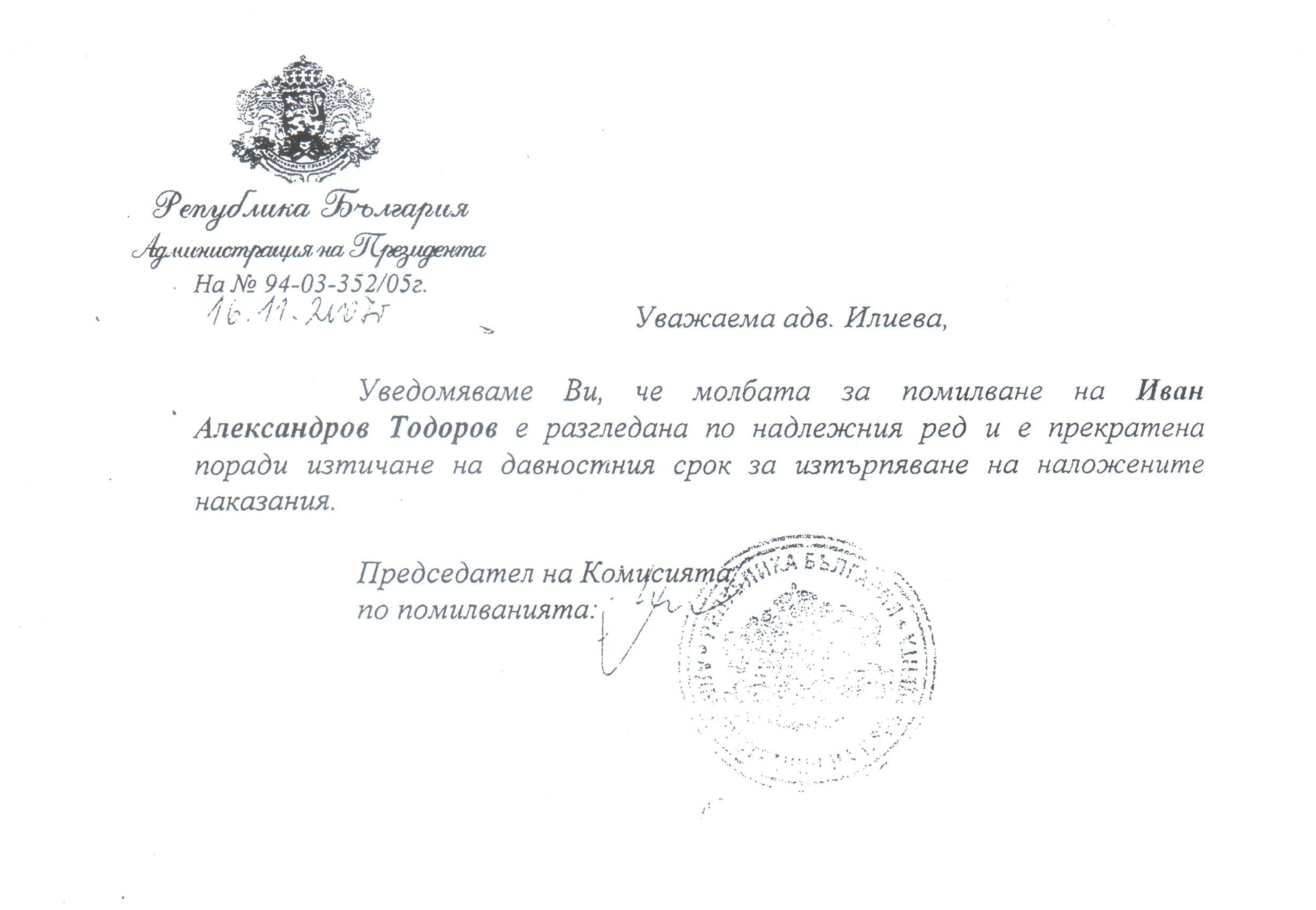 Уведомяваме Ви, че молбата за помилване на Иван Александров Тодоров е разгледана по надлежния ред и е прекратена поради изтичане на давностния срок за изтърпяване на наложените наказания.