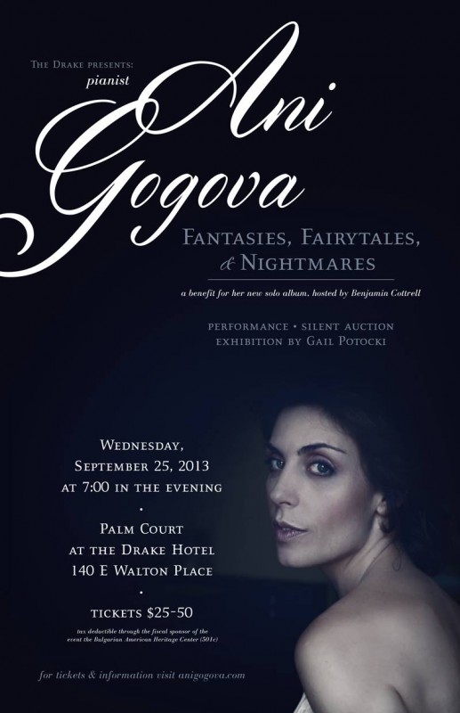 One of the most anticipated events on Chicago’s musical scene this fall will take place at the exquisite Palm Court of the Drake Hotel. Internationally renowned pianist Ani Gogova will appear in a recital featuring the Moonlight Sonata by Beethoven, Fantasies by Schumann, Brahms, and Shostakovich, Fairytales by Medtner and Musica Ricercata by Ligeti. Praised for her “dazzling artistic presence”, “masterful poetic expression”, “ravishing colors”, and “virtuoso technique beyond reproach”, Ani is returning to the Drake after sold-out performance of her iAN&ANi duo with Russian cellist Ian Maksin earlier this year. Raising funds for Ani’s upcoming album “Fantasies, Fairytales, and Nightmares”, this event will feature an art exhibition by Symbolist artist Gail Potocki, who utilizes the skills and techniques of the Old Masters to create lush allegories rooted in compelling realism, branching seductively into the realms of possibility. Silent auction of products and services donated by local artists and businesses will conclude the evening. All contributions, including tickets, are tax deductible through the fiscal sponsor of the project, the Bulgarian American Heritage Center (501c).