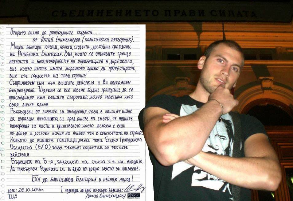 Октай Енимехмедов, студентът, който заплаши тази пролет на конференция на ДПС почетния председател на тази партия Ахмед Доган с газов пистолет, и сега се намира в Централния софийски затвор, е написал Отворено писмо до протестиращите студенти и до гражданите на страната, които подкрепят техния протест. Писмото вече се разпространява в социалната мрежа Фейсбук.