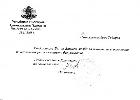 Писмо с изх. № 94-03-756/21.11.2008 г.: „Уведомяваме Ви, че Вашата молба за помилване е разгледана по надлежния ред и е оставена без уважение. Главен експерт в Комисията по помилванията: М. Коцева“