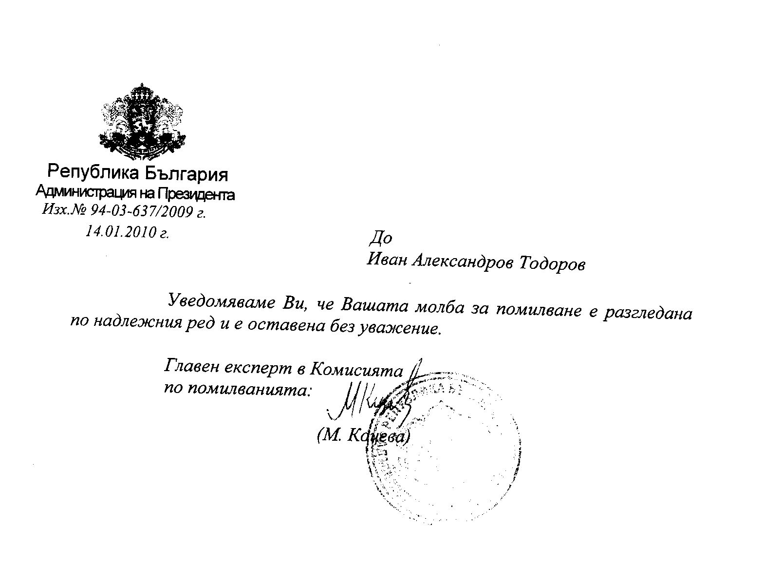 Писмо с изх. № 94-03-637/14.01.2010 г.: „Уведомяваме Ви, че Вашата молба за помилване е разгледана по надлежния ред и е оставена без уважение. Главен експерт в Комисията по помилванията: М. Коцева“