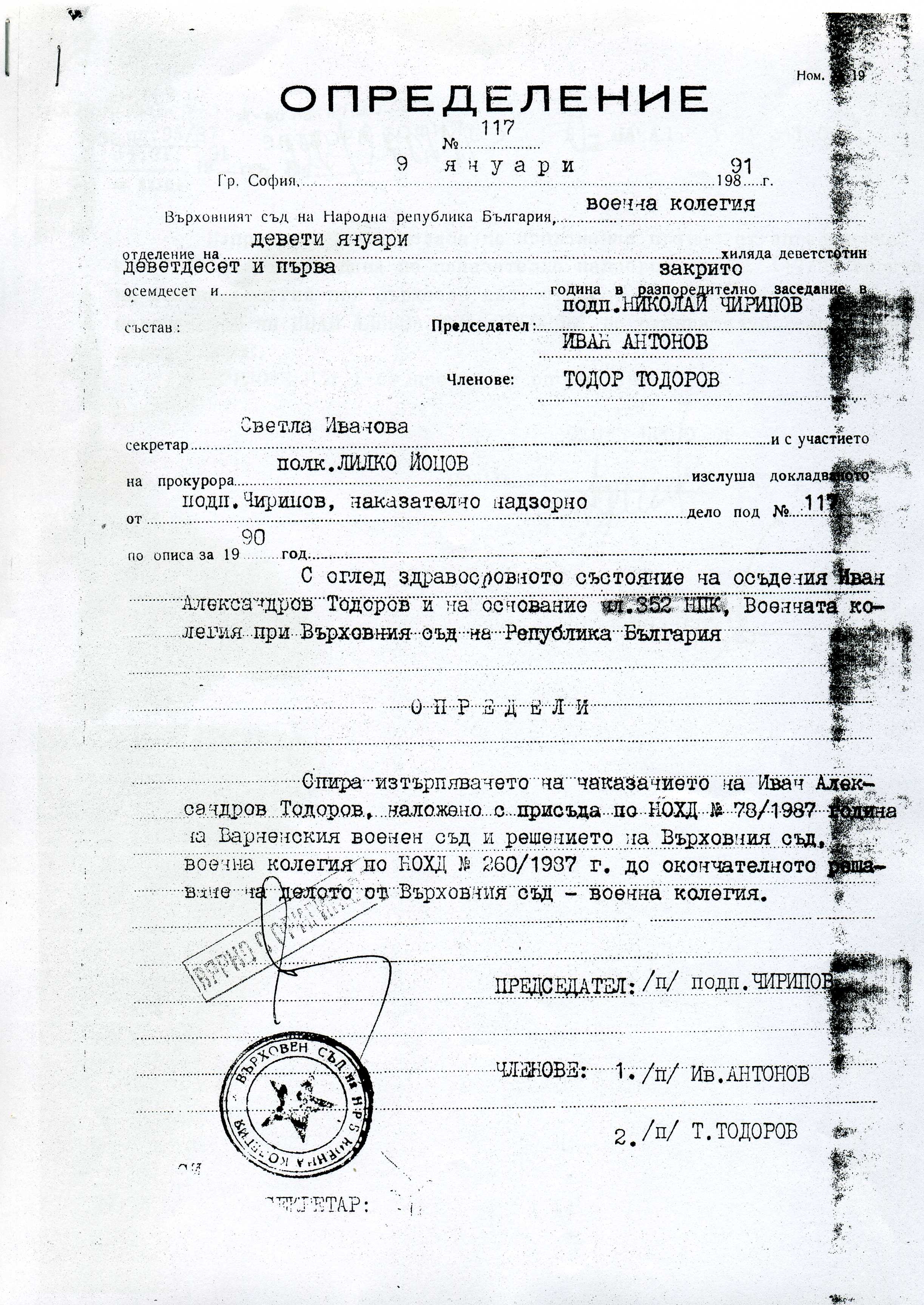 5. С решение № 18 от 03.12.1992 г. по н.н.д. № 117/1991 г. Върховният съд на Народна република България, военна колегия, е оставил без уважение молбата на осъдения Иван Александров Тодоров за преглед по реда на надзора на присъда № 78 от 08.04.1987 г. по н.д. № 78/1987 г. на Варненския военен съд и решение № 263 от 22.06.1987 г. по н.д. № 260/1987 г. на Върховен съд, военна колегия.“