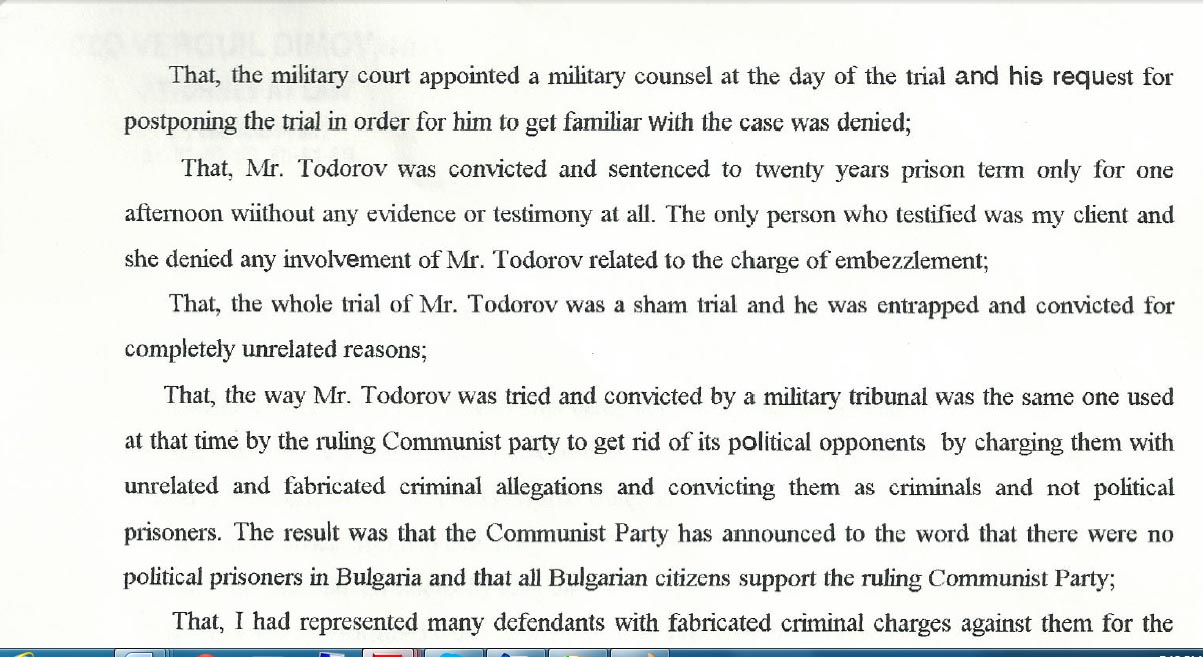 „…Преди 24 г. бях осъден от Варненския Военен съд на 20 год. Лишаване от свобода – случай, с който Вие сте детайлно запознат. Единственото жилище на четиричленното ми семейство бе вписано като „вила“ и бе конфискувано. Осъждането ми е несправедливо, защото не съм извършил подобно престъпление.