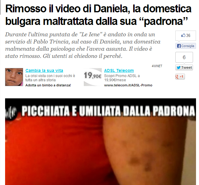 Българката Даниела е жестоко малтретирана в италиански дом, където работила като домашна помощница. Чрез скрита камера милиони италиански зрители на ТВ предаването Le Iene стават свидетели на насилието и униженията на нашенката.