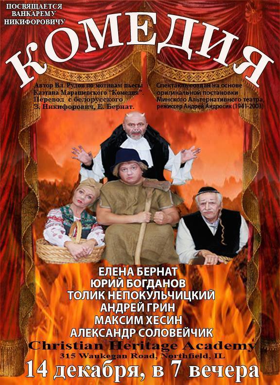 14 декабря в Чикаго состоится премьера спектакля “Комедия” по пьесе белорусского драматурга и педагога Владимира Рудова. В спектакле заняты Елена Бернат (Маланка), Юрий Богданов (Давид), Андрей Грин (Дема), Анатолий Непокульчицкий (Черт).