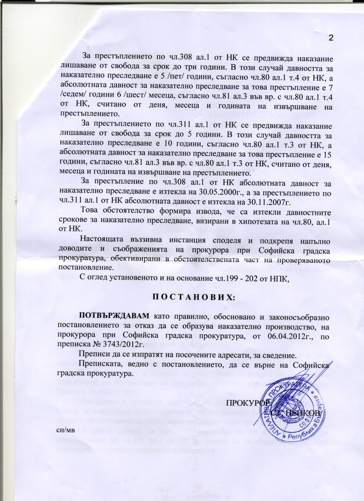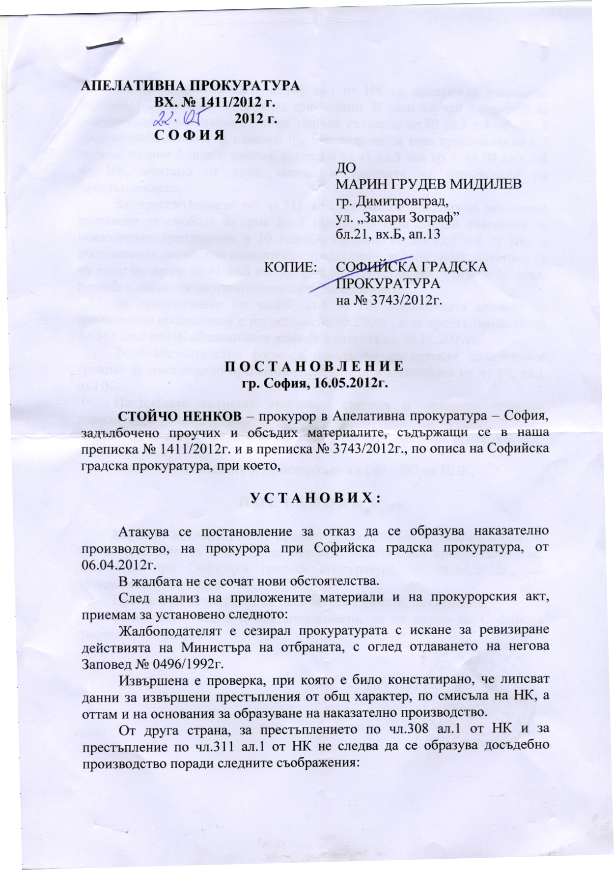 II. Постановление на Апелативна прокуратура – София от 16.05.2012 г., с което се потвърждава като „правилно, обосновано и законообразно постановлението за отказ да се образува наказателно производство на прокурора при Софийска градска прокуратура, от 6.04.2012 г., по преписка № 3743/2012 г.“; 1 и 2 стр. Постановлението е изпратено на Марин Мидилев на 22.05.2012 г.