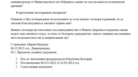 Редовият все още български гражданин Марин Грудев Мидилев пише до техни превеличества, Министър председателя Орешарски, Председателя на Народното събрание Миков и Главния прокурор Цацаров (Вж.: Иск нов – б.а.):