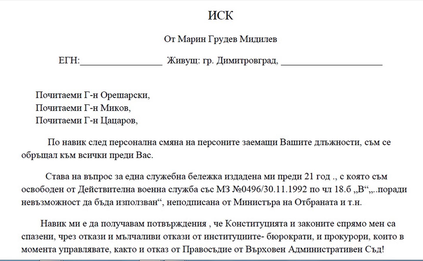 „По навик след персонална смяна на персоните, заемащи вашите длъжности, съм се обръщал към всички вас”… ; „Протестът ми е бил винаги един и същ…”; „Навик ми е да получавам потвърждения, че Конституцията и законите спрямо мен са спазени, чрез откази или мълчаливи откази от институциите – бюрократи и прокурори, които в момента управлявате, както и отказ от правосъдие от Върховен административен съд!”…