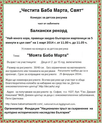 На 27, 28 февруари и 1 март, в централното фоайе на Националния дворец на културата в София, ще се проведе събитието „Честита Баба Марта, Свят“, част от Балканския рекорд „Най-много хора, правещи Български мартеници за 5 минути в цял свят“. Да разкажем и покажем на света вълшебната традиция “Баба Марта“.