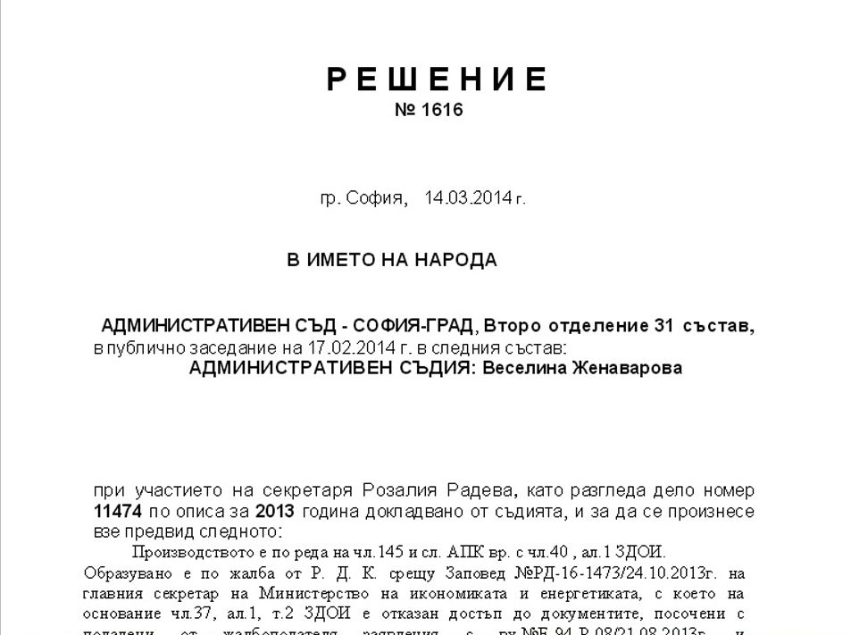 Съдът намира, че исканата от жалбоподателя (Роман Кендеров – б.р.) информация е „обществена“ по смисъла на чл.2, ал.1 ЗДОИ, и тъй като дава възможност на гражданите да си съставят собствено мнение относно дейността на задължен по закона субекти – в случая министъра на икономиката и енергетиката, който съгласува проектите съгласно чл.82 Закона за подземните богатства…“