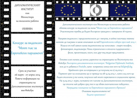 Дипломатическият институт към Министъра на външните работи обявява конкурс за видеоклип на тема “Моят глас за Европейски парламент”.