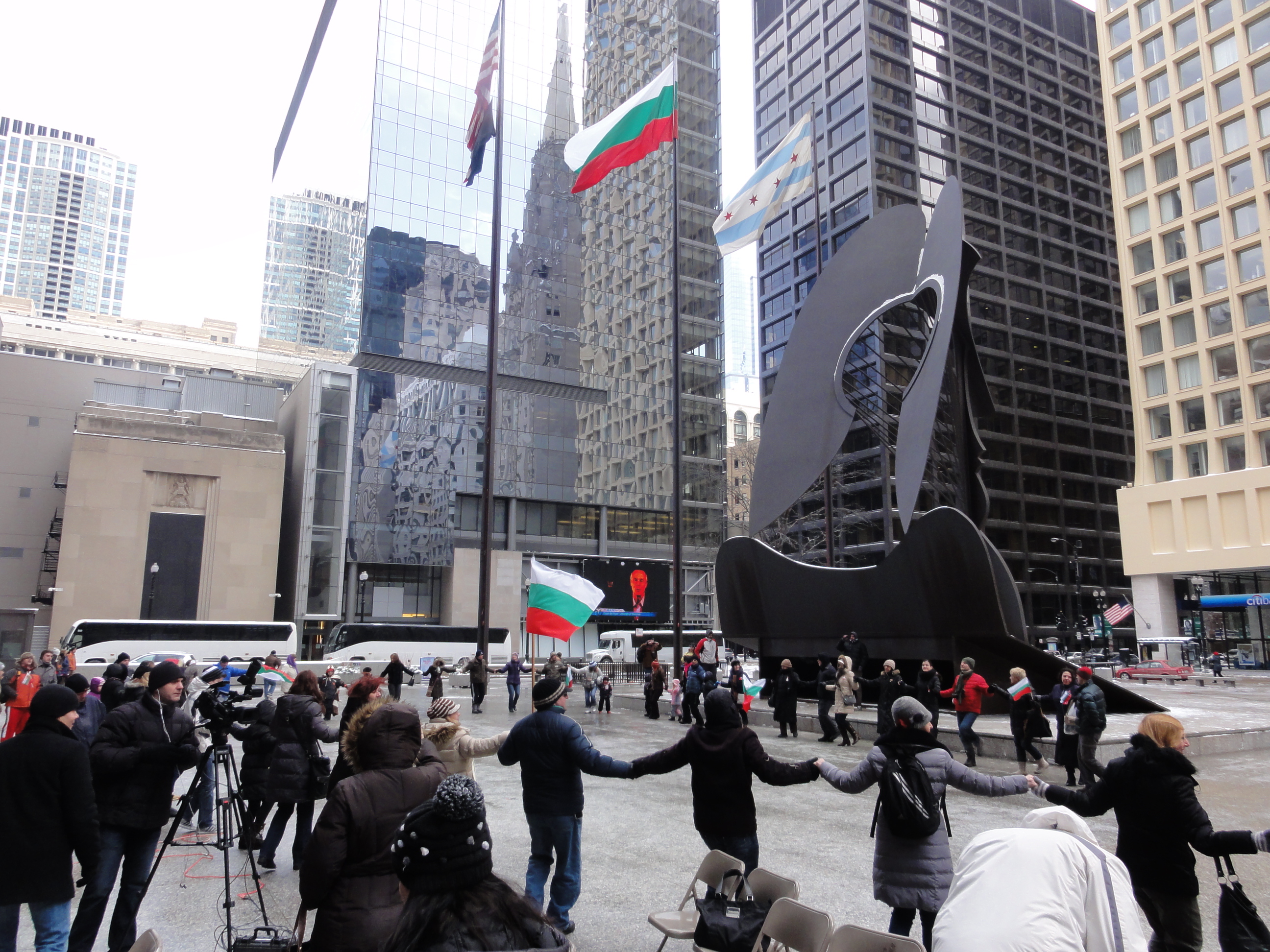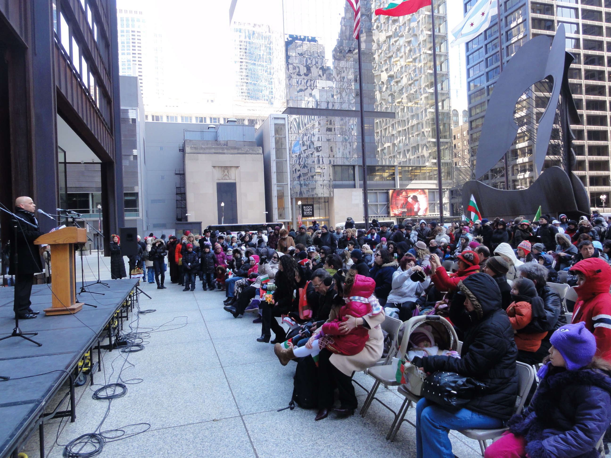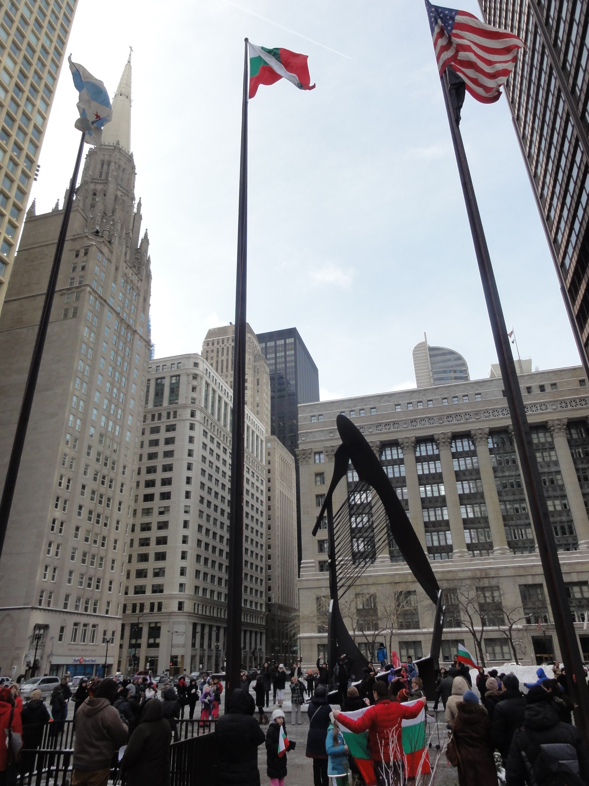 Вчера, 2 март 2014 г., в центъра на Чикаго (на Дейли Плаза, пред кметството на града), за пореден път официално бе издигнат трибагреникът на България. Под звуците на националния ни химн, българското знаме се развя редом с американското и това на щата Илинойс.
