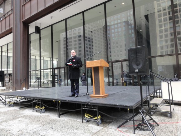 След като отзвуча химнът на България и трибагреникът бе издигнат между небостъргачите, приветствие произнесе генералният консул на Република България в Чикаго Симеон Стоилов. Той благодари на събралите се, изказа радостта си от празничното настроение, което цари въпреки лошото време, и съобщи за получените тържествени поздравителни писма от кмета на града Рам Емануел, от губернатора на щата Илинойс Пат Куин, и от Лиса Мадиган, главен прокурор на щата. Генералният консул завърши речта си с думите: „Продължавайте да бъдете горди и достойни българи, независимо къде сте по-света. И нека да научим нашите деца да разпознват България!“