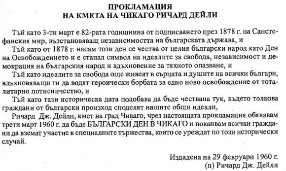 Традицията да се издига българското знаме в центъра на Чикаго датира от преди повече от 50 години. През февруари 1960 г. група български имигранти се срещат с градоначалника Ричард Дейли (Richard J. Daley). Разказват му за родината си, за нейната история и за годините на вековното турско иго. Впечатлен от историята на народа ни и от постиженията на емигрантите ни, кметът издава специална Прокламация (вж. тук), с която обявява 3-ти март за български ден в Чикаго. Тази Прокламация дава право в центъра на града в 12.00 ч. на обяд на 3-ти март да се издига българското знаме. Този ритуал се повтаря няколко години, но по-късно със смяната на кметовете на града и поради други, неизвестни за нас причини, е забравен.