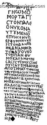 „Κα[ν]α συβιγη Ωμο<μο>ρταγ ις τον παλεον υκον αυτου μενο(ν) επυησεν υπερφυμον υκο(ν) ις τον Δανουβην κ(ε) αναμεσα τον δυο υκο(ν) τον πανφυμο(ν) καταμετρησας ις τιν μεσην επυισα τουμβαν κε απο τιν αυτη(ν) μεσην της τουμβας εος την αυλι(ν) μου την αρχεα(ν) ισιν οργηε μυριαδες β’ κ(ε) επι τον Δανουβιν ισην οργιες μυριαδες β’. το δε αυτο τουβι(ν) εστιν πανφυμο(ν) κ(ε) μετρισα(ν)τες τιν γιν επυισα τα γραματα ταυτα. ο ανθροπος κ(ε) καλα ζον αποθνισκι κε αλος γενατε κε ινα ο εσχατον γηνομενος ταυτα θεορον υπομνησκετε τον πυισαντα αυτο. το δε ονομα του αρχοντος εστην Ωμορταγ καν(ν)α συβιγη· ο Θ(εο)ς αξηοσι αυτον ζισε ετη ρ’.“