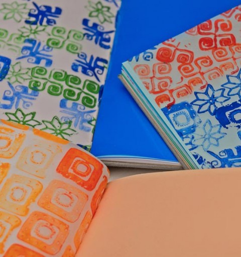 И две интерпретации от мен, Деляна Симеонова: възглавница Елбетица и покривала за сервиране (placemats), с ръчен блок принт на елементи от Елбетицата: