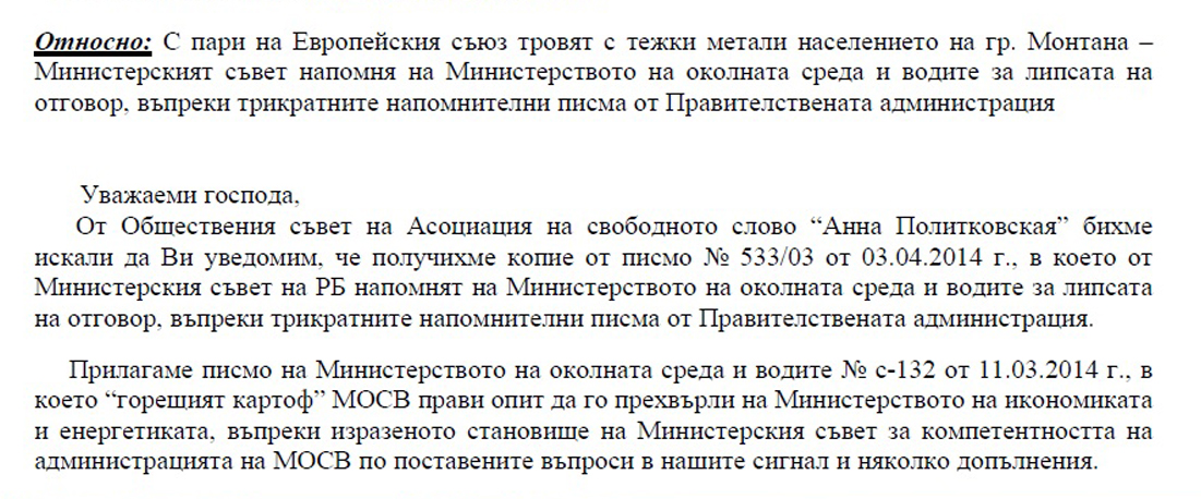 От Обществения съвет на Асоциация на свободното слово “Анна Политковская” бихме искали да Ви уведомим, че получихме копие от писмо № 533/03 от 03.04.2014 г., в което от Министерския съвет на РБ напомнят на Министерството на околната среда и водите за липсата на отговор, въпреки трикратните напомнителни писма от Правителствената администрация.
