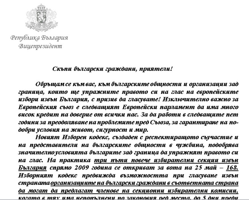 Президентската администрация изпрати до медиите писмо на българския вицепрезидент Маргарита Попова до българските граждани в чужбина, в което тя се обръща към тях във връзка с изборите за Европейски парламент.