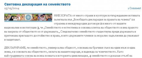 * Седем кандидати за евродепутати са подкрепили Декларацията за насърчаващи семейството политики в Европейския парламент. Те са се ангажирали да подкрепят правото на всяка страна да определя политиката си в сферата на брака, семейството, родителските права и образованието. С подкрепата на декларацията са обещали да работят за утвърждаване на семейството, основано на брачния съюз между един мъж и една жена, както и правото на родителите като първостепенно отговорни за възпитанието, здравето и образованието на децата им. Декларациятa е била подкрепена от Меглена Кунева, Светослав Малинов, Корман Исмаилов, Николай Ненчев и Гергана Николова от Реформаторски блок, Магдалена Ташева от „Атака“ и Валентин Симов от „Партия на зелените“. Инициативата остава отворена за подкрепа от кандидатите.