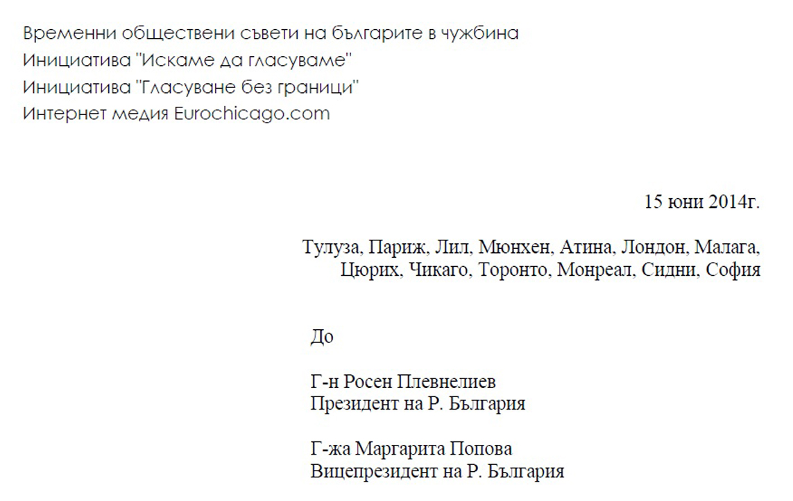 Временните обществени съвети на българите в чужбина, Инициатива “Искаме да гласуваме”, Инициатива “Гласуване без граници” и българският информационен портал Eurochicago.com изпратиха писмо – апел до президента Росен Плевнелиев и до вицепрезидента Маргарита Попова.
