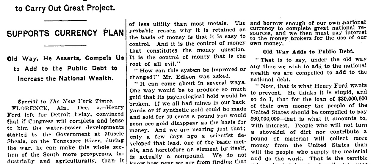 “По стария начин с издаването на държавни облигации всякога , когато искаме да добавим към националното ни богатство, ние сме принудени да увеличим националния дълг. Това е, което Хенри Форд иска да предотврати. Той мисли, че е глупаво, което е и моето мнение, че срещу заем от $30 милиона от собствените му пари народът на САЩ ще трябва да бъде принуден да заплати $66 милиона – това е цифрата с лихвата. Хора, които няма да са помирисали лопата пълна с пръст или да са дали някакъв материал за изпълнението на проекта, ще приберат повече пари от САЩ, отколкото хората, доставили материалите и извъшили работата. Това е ужасното нещо относно лихвата. Във всичките ни издавания на държавни облигации лихвата е винаги по-голяма от главницата. Поради това всичките ни велики обществени проекти струват повече от два пъти от истинската им стойност. При сегашната ни система на правене на бизнес ние просто добавяме 120% до 150% към определената цена.”