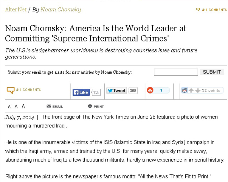 * Ноам Чомски е американски философ и политически активист, професор в Масачузетския технологичен институт. Статията в AlterNet – издание за независими анализи за вътрешната и външна политика на САЩ, е публикувана на 7 юли под заглавие „Noam Chomsky: America Is the World Leader at Committing ‘Supreme International Crimes'“.